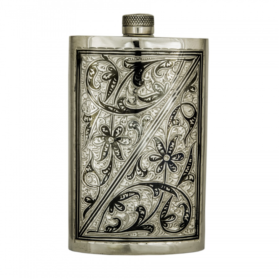 Серебряная фляга. Гравировка, чернь. Стоимость изделия может меняться в зависимости от массы изделия.