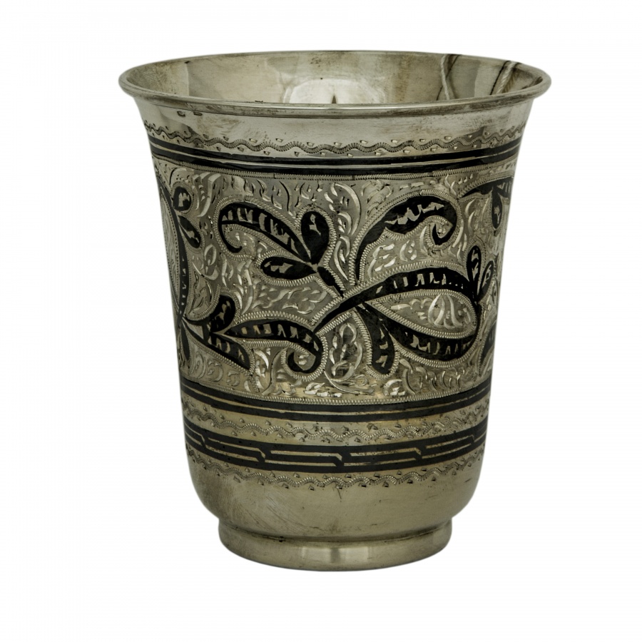 Серебряный стакан. Гравировка, чернь. Стоимость изделия может меняться в зависимости от массы изделия.
