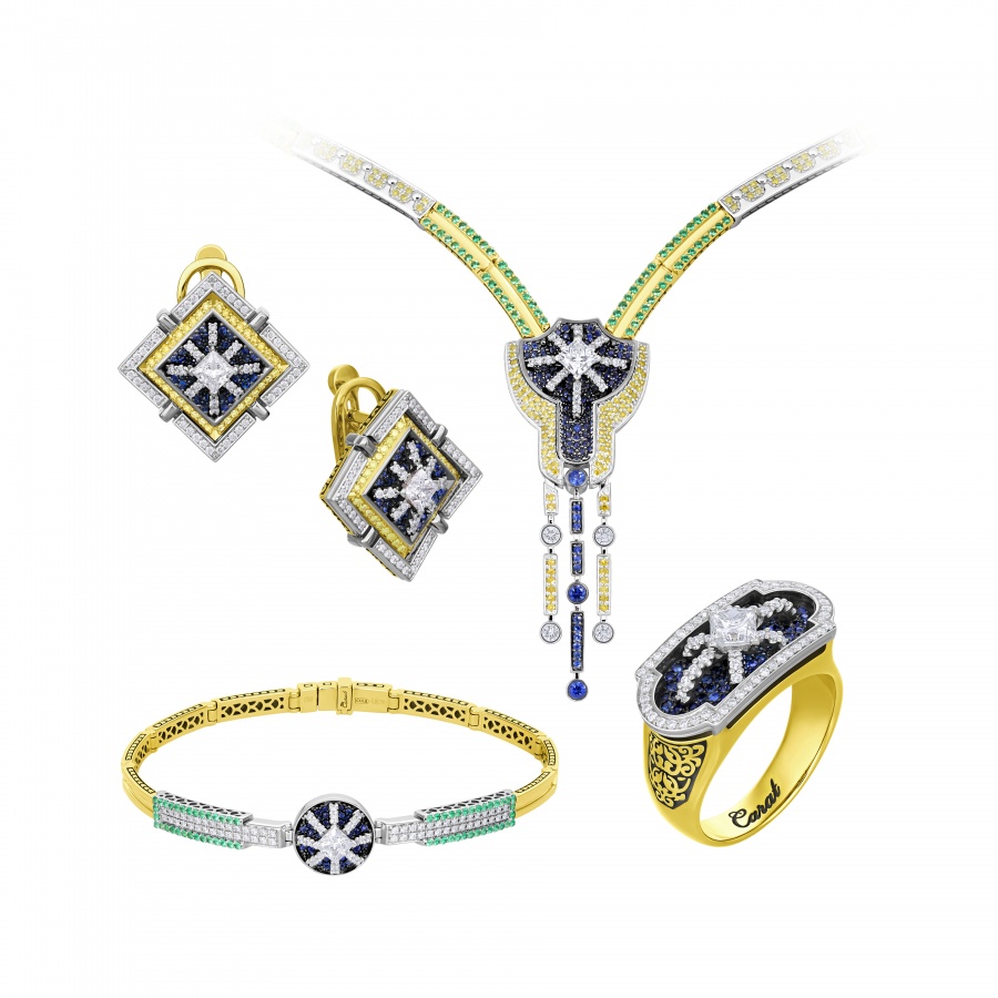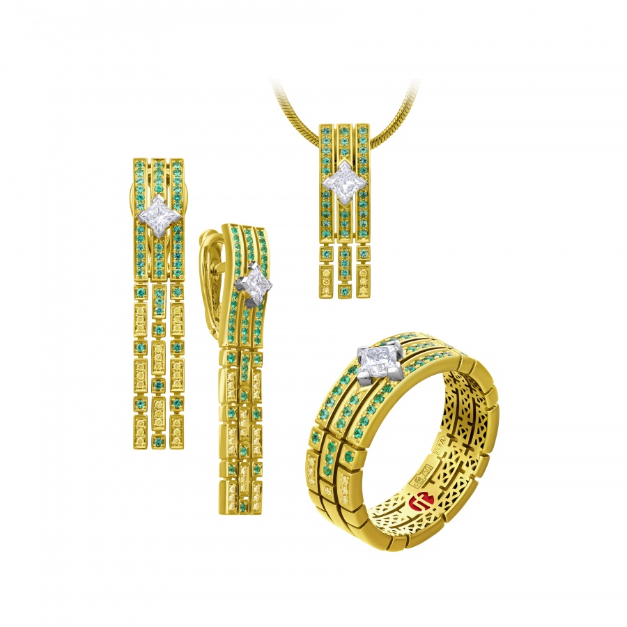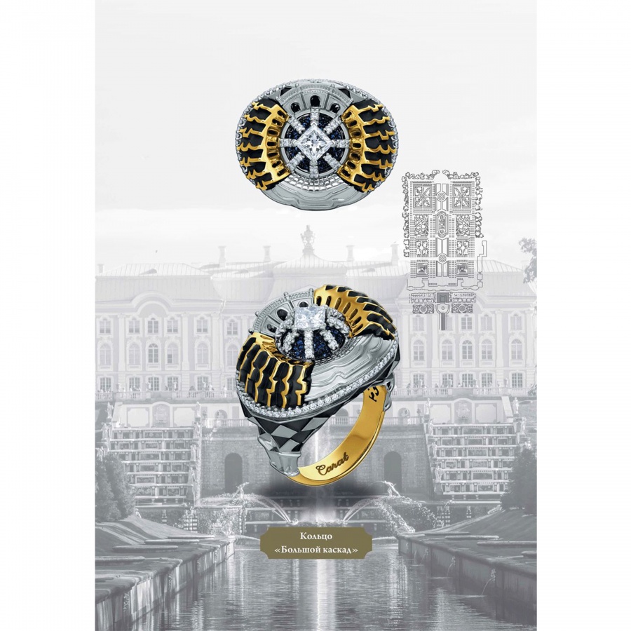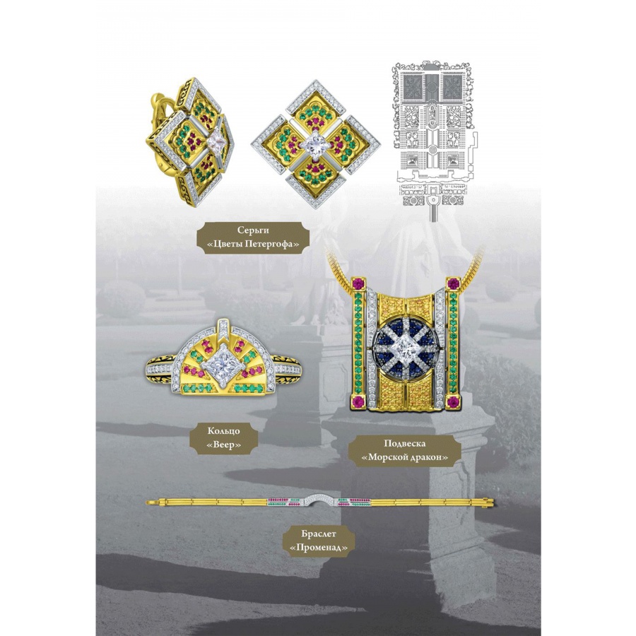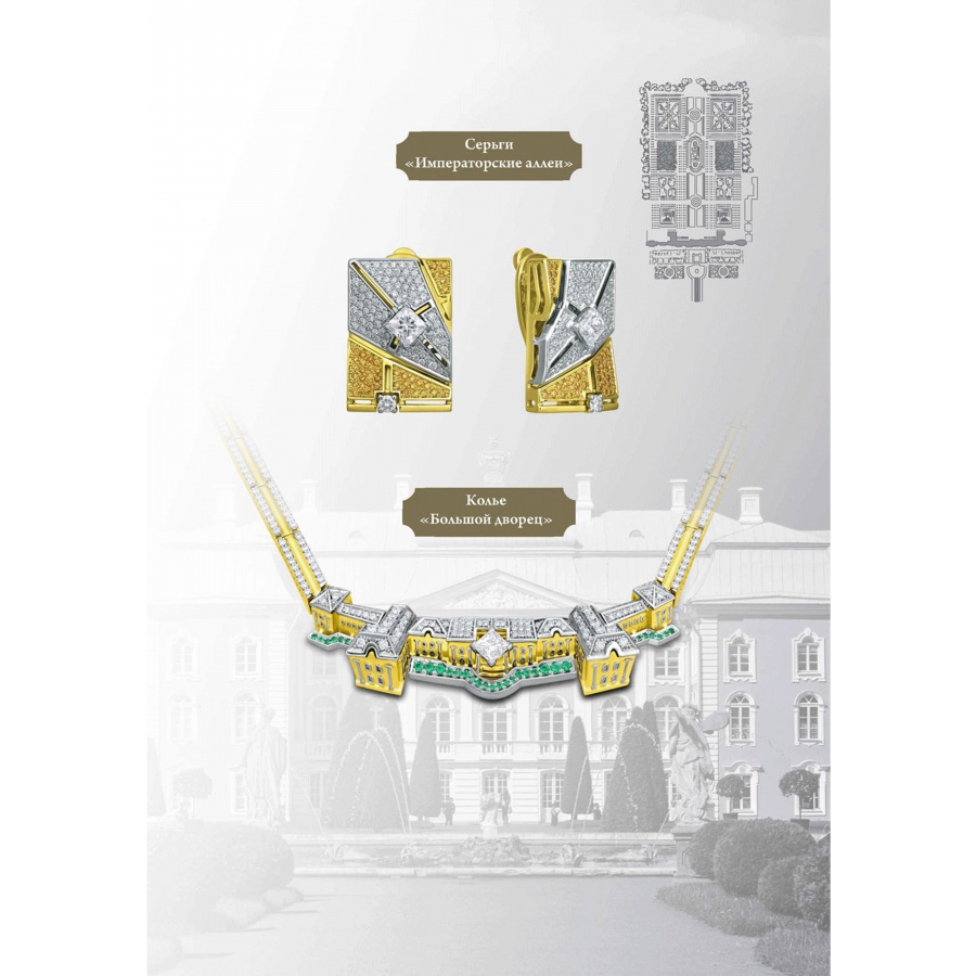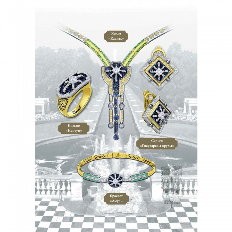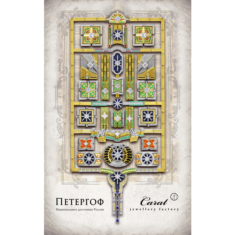 Коллекция "Петергоф", созданная CHAMOVSKIKH jewellery house и ювелирным холдингом JF Carat, включает в себя 20 ювелирных украшений, изготовленных из золота 750 пробы и драгоценных камней: бриллиантов, изумрудов сапфиров, рубинов и фантазийных бриллиантов желтого цвета. Коллекция исполнена в 11 экземплярах, один из которых будет постоянно экспонироваться в Государственном музее-заповеднике "Петергоф". Один из 11 экземпляров вы можете приобрести у нас в магазине.
