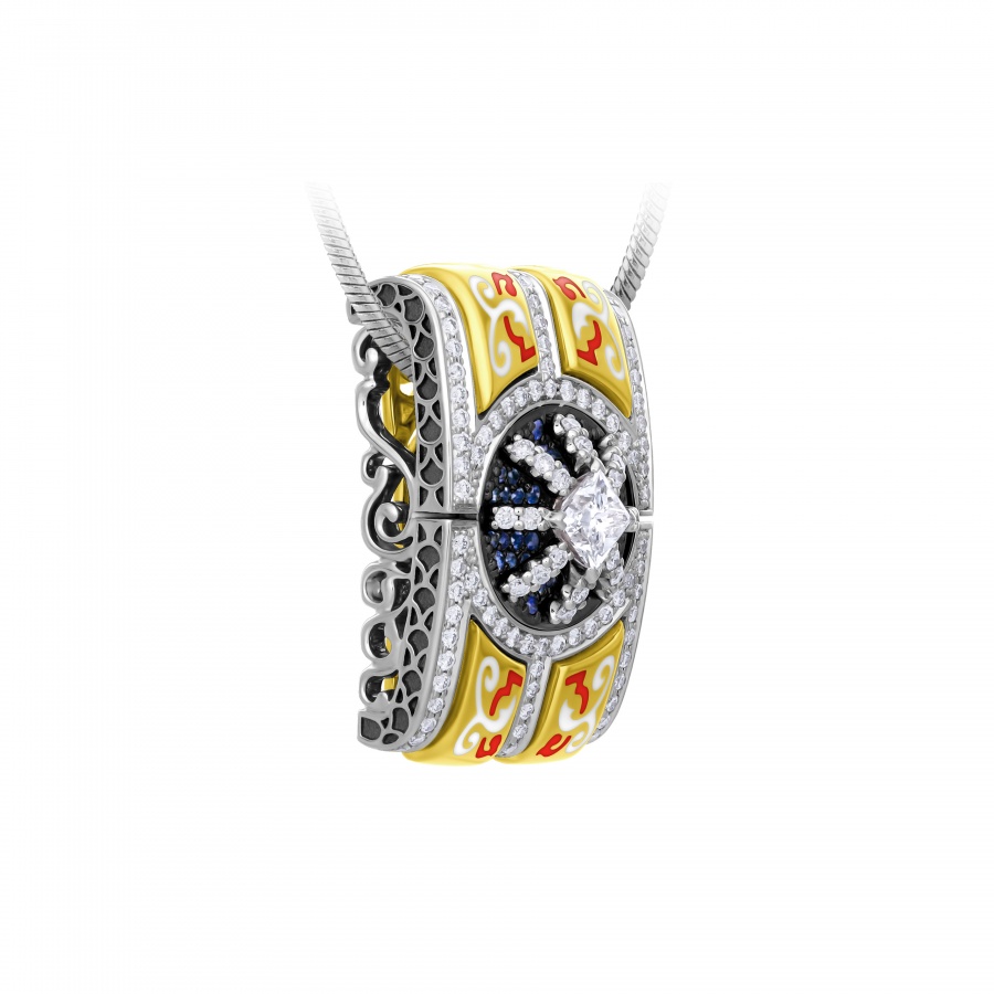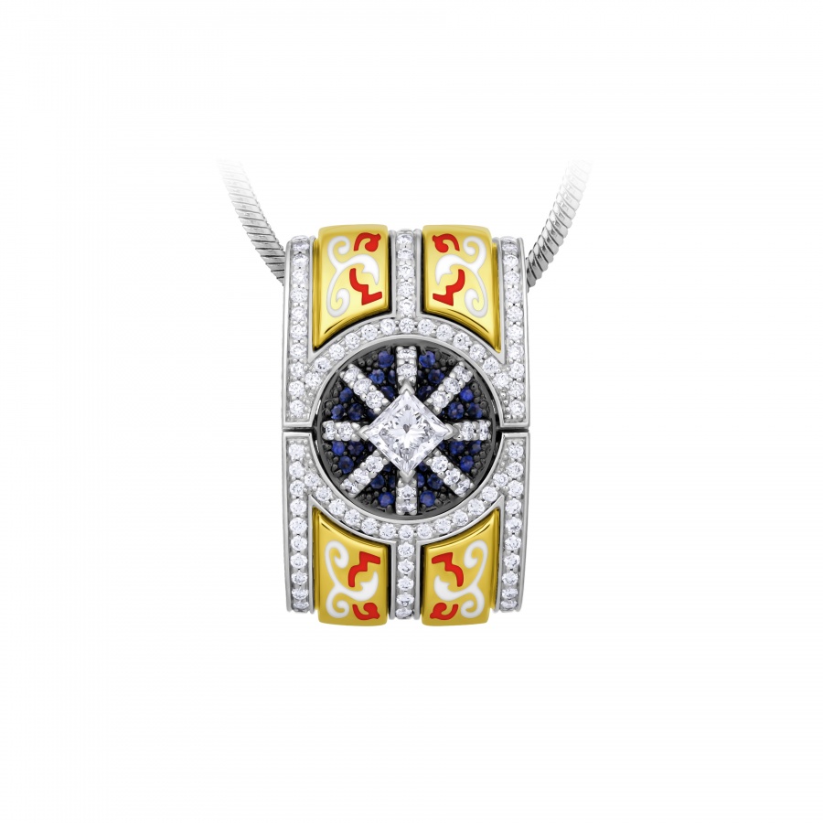 Подвес «Русский Версаль» входит в коллекцию «Петергоф», ставшую признанным произведением ювелирного искусства. Украшение вдохновлено образом Французского фонтана Петергофа. Центральный бриллиант огранки «принцесса», искрящиеся сапфиры и бриллианты воплощают свободные водные потоки в солнечных лучах. А яркий орнамент из нанокерамики олицетворяет очарование цветочных газонов парка.