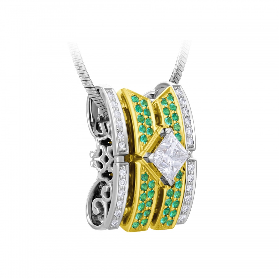 Подвес «Верхний сад» с бриллиантовой и изумрудной инкрустацией в желтом золоте достоверно и живо передает геометрию садово-паркового ансамбля летней резиденции Дома Романовых. Вы можете познакомиться с украшениями коллекции лишь в нескольких ювелирных салонах России и в Особой кладовой государственного музея-заповедника «Петергоф». Там наравне с другими произведениями мирового искусства представлены драгоценности от JF Carat.